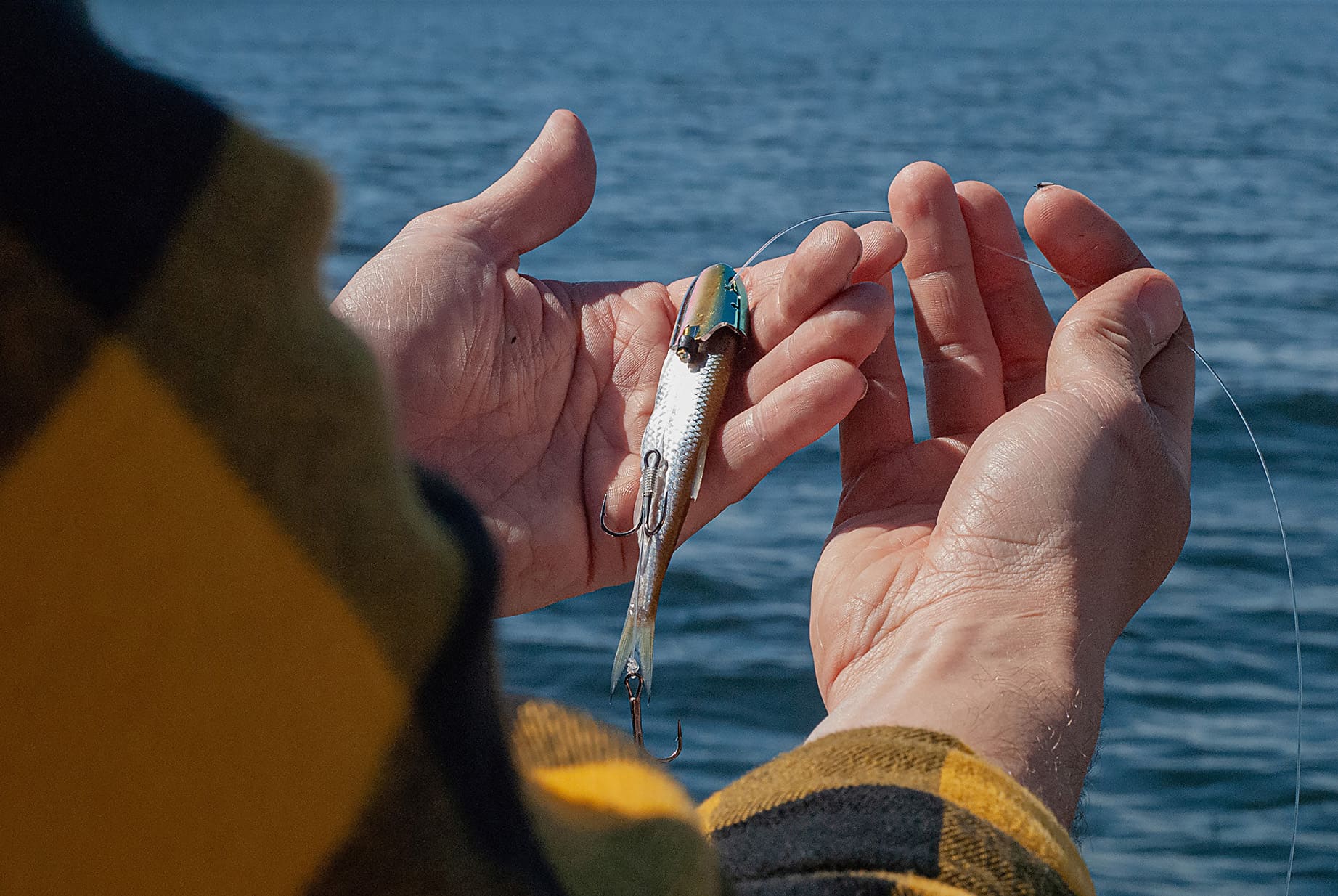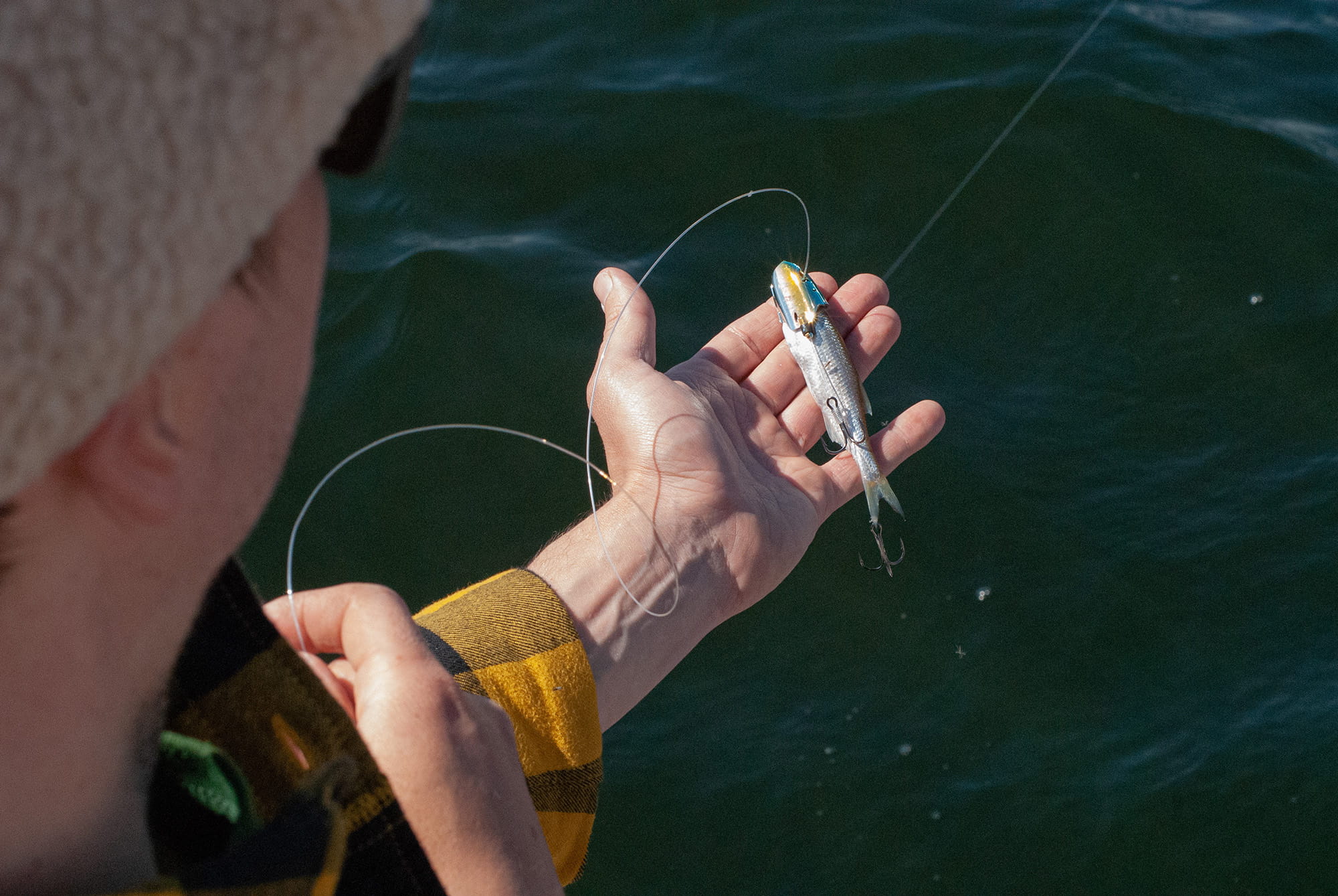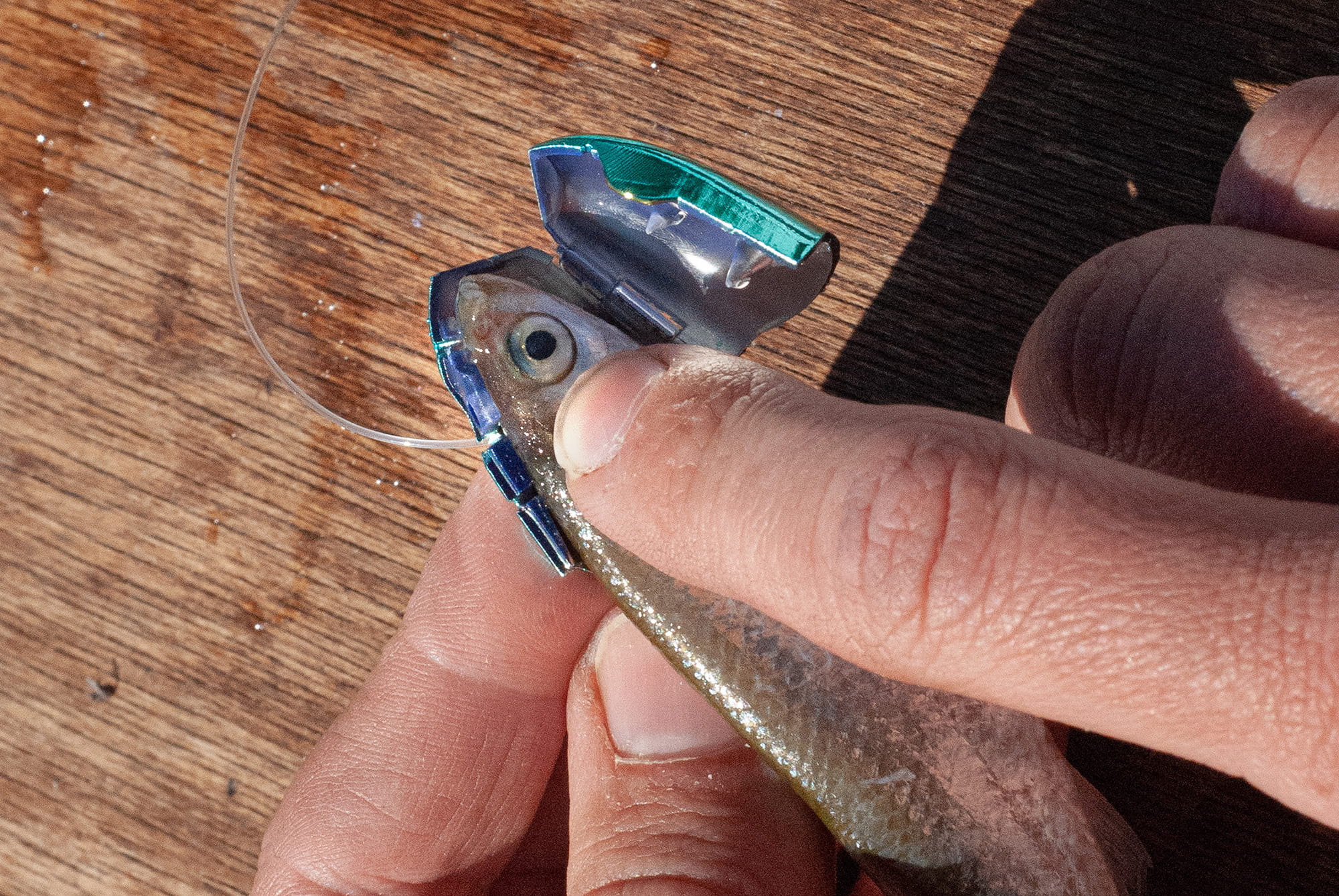 Fäst krokarna vid önskad punkt på betet och börja justera gångrörelsen genom att sträcka tafsen för en svag böj på betesfisken.